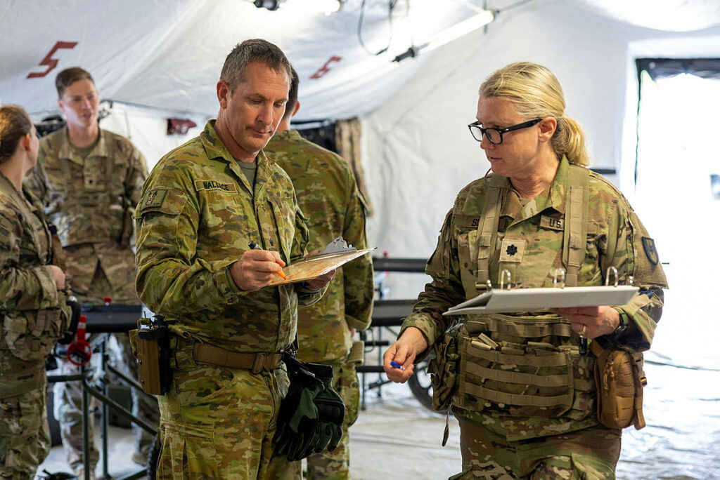 CAPTION: Australian Army officer Major Adam Wallace, of 4th Health Battalion, manages patient flow with a United States Army officer at the Role 3 field hospital during Exercise Orient Shield.