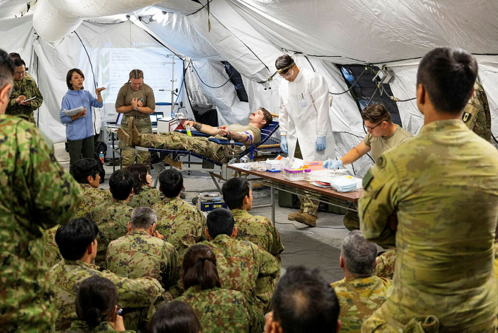 CAPTION: Australian Army and Japan Middle Army personnel observe blood bank training by the United States Army at the Role 3 field hospital on Exercise Orient Shield.