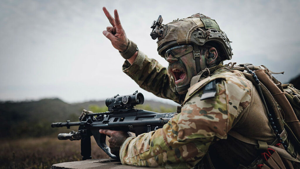 CAPTION: A soldier from 2nd Battalion, the Royal Australian Regiment, gives fire control orders during the Duke of Gloucester Cup. Photo by Corporal Cameron Pegg.