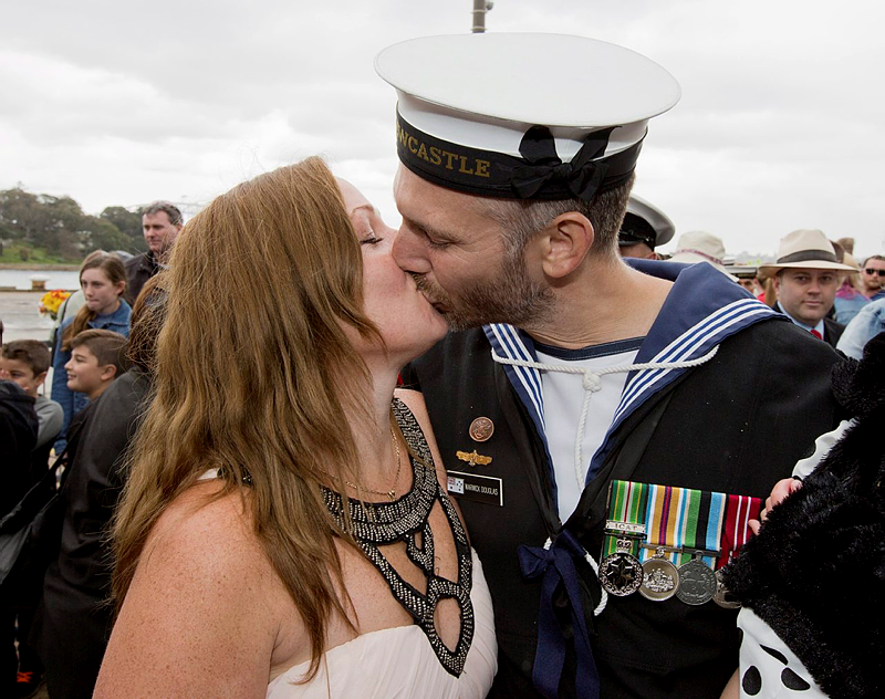 SHE SAID YES! Leading Seaman Warwick Douglas kisses his new fiancée after proposing to her on the wharf of Fleet Base East. Photo by Able Seaman Tom Gibson.