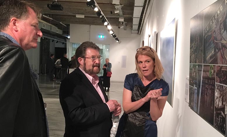 Senator Derryn Hinch discusses a veteran's artwork with ANVAM Head of Arts Programs Tanja Johnston and curator Bruce Copland. ANVAM photo.