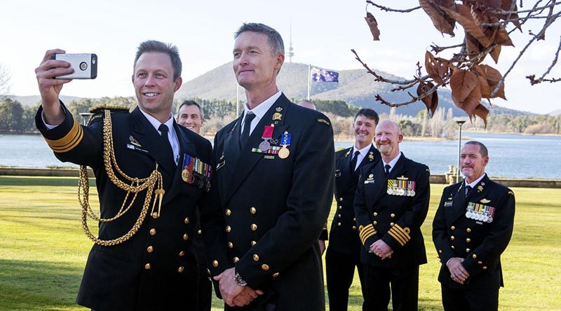 CAPTION: Chief of Navy Vice Admiral Michael Noonan takes a selfie with Chief Petty Officer Troy Eather at Government House, Canberra, after the presentation of bravery medals and awards for Australian Thai cave rescuers. Photo by Lieutenant Tony Martin.