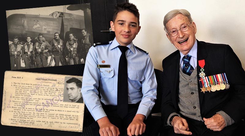 CAPTION: CCPL Chevvy Dolan (608 Squadron, AAFC) with Bomber Command veteran Doug Leak and, inset top, Doug Leak (extreme left of picture), as a Flight-Sergeant with his Wellington bomber crewmates in 1944, and, inset bottom, Doug Leak’s photo inside his Royal Australian Air Force paybook.
