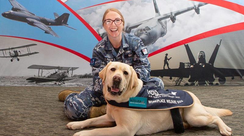 CAPTION: Hooper, the workplace welfare dog, receives a pat from Squadron Leader Lauretta Searle during Hooper’s visit to the [Royal Australian] Air Force 2021 office at RAAF Base Fairbairn. Photo by Corporal Kylie Gibson. Story by Squadron Leader Lauretta Searle.