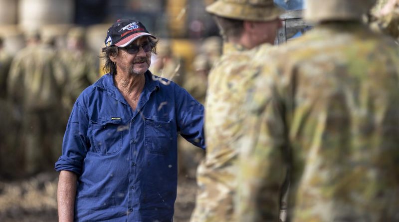 CAPTION: A northern New South Wales farmer watches Army soldiers from 8th/12th Regiment, Royal Australian Artillery, load feed for his stock into his ute as part of Operation Flood Assist 2022. Photo by Corporal Dustin Anderson.