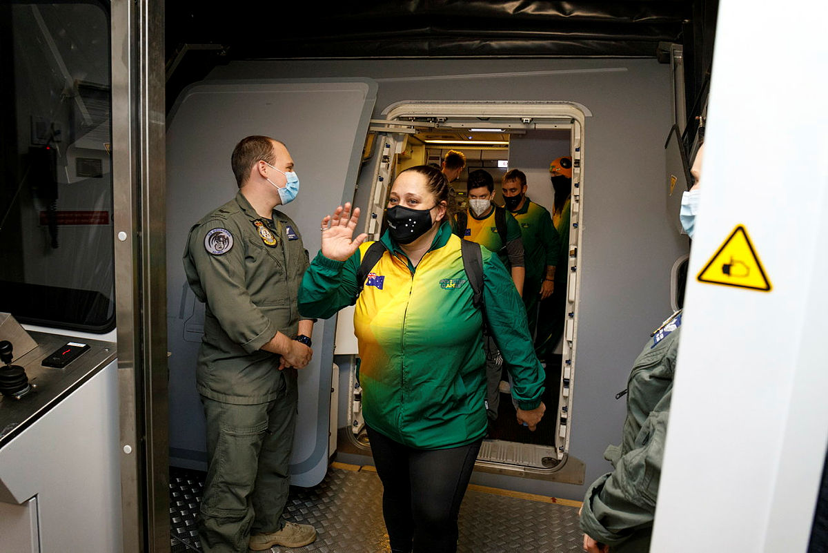 The 32 competitors joined 27 staff members and 72 family and friends on an Air Force KC-30A aircraft from Sydney to give the team time to prepare ahead of their events.