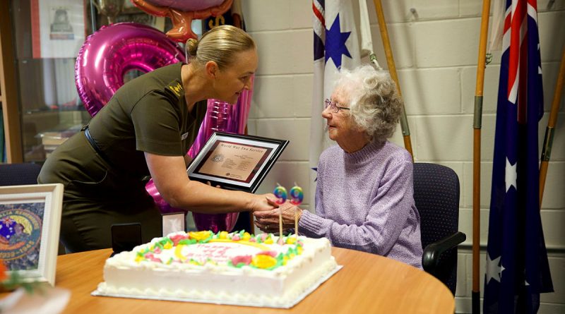 CAPTION: Director Recruiting – Army Colonel Kimberlea Juchniewicz congratulates veteran Signaller Norma Eggleston as she celebrated her 99th birthday at the Woden RSL club sub-branch, Canberra. Story by Major Anne-Maree Hunt. Photo by Lieutenant Colonel David Hankin.