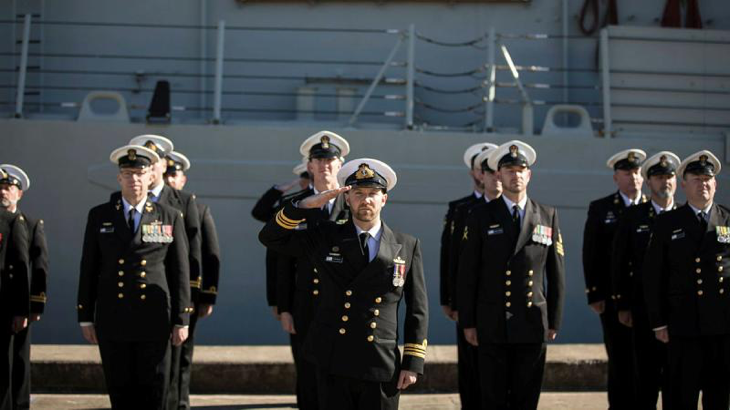 CAPTION: Lieutenant Commander Nicholas Graney salutes during the national anthem as part of HMAS Newcastle’s decommissioning ceremony at Fleet Base East, Sydney, in 2019. Story by Olivia Ransome Gilding. Photo by Able Seaman Jarrod Mulvihill.