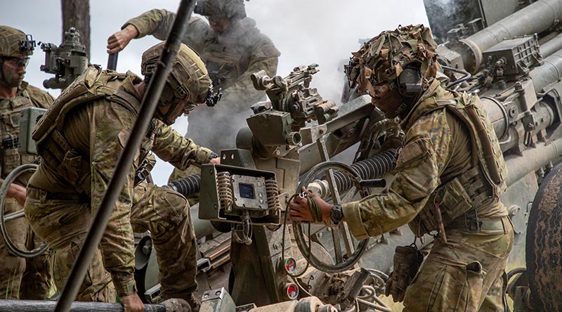 CAPTION: Australian Army soldiers from the 1st Regiment, Royal Australian Artillery, fire an M777 howitzer during a live-fire exercise at Shoalwater Bay Training Area. Photo by Private Andrew Shaw.