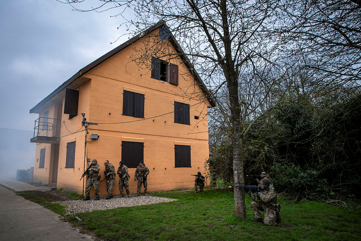 CAPTION: Armed Forces of Ukraine personnel perform an urban assault as part of the platoon and company sergeants battle course run by Australian Army soldiers deployed on Operation Kudu in the United Kingdom.
