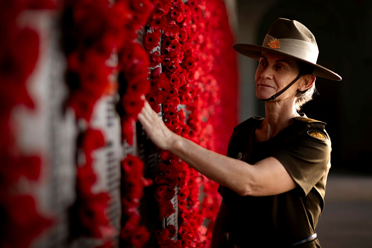 CAPTION: Army soldier Corporal Julie Kling, of Australia’s Federation Guard, places her hand on the name of Private Charles Henry Kling at the Australian War Memorial’s Roll of Honour, Canberra.