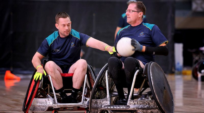 CAPTION: Team Australia’s Ben Owens, right, moves past Jamie Adam Smyth during a wheelchair rugby training session in preparation for the Warrior Games 2024. Story by Flying Officer Tina Langridge. Photo by Flight Sergeant Christopher Dickson.