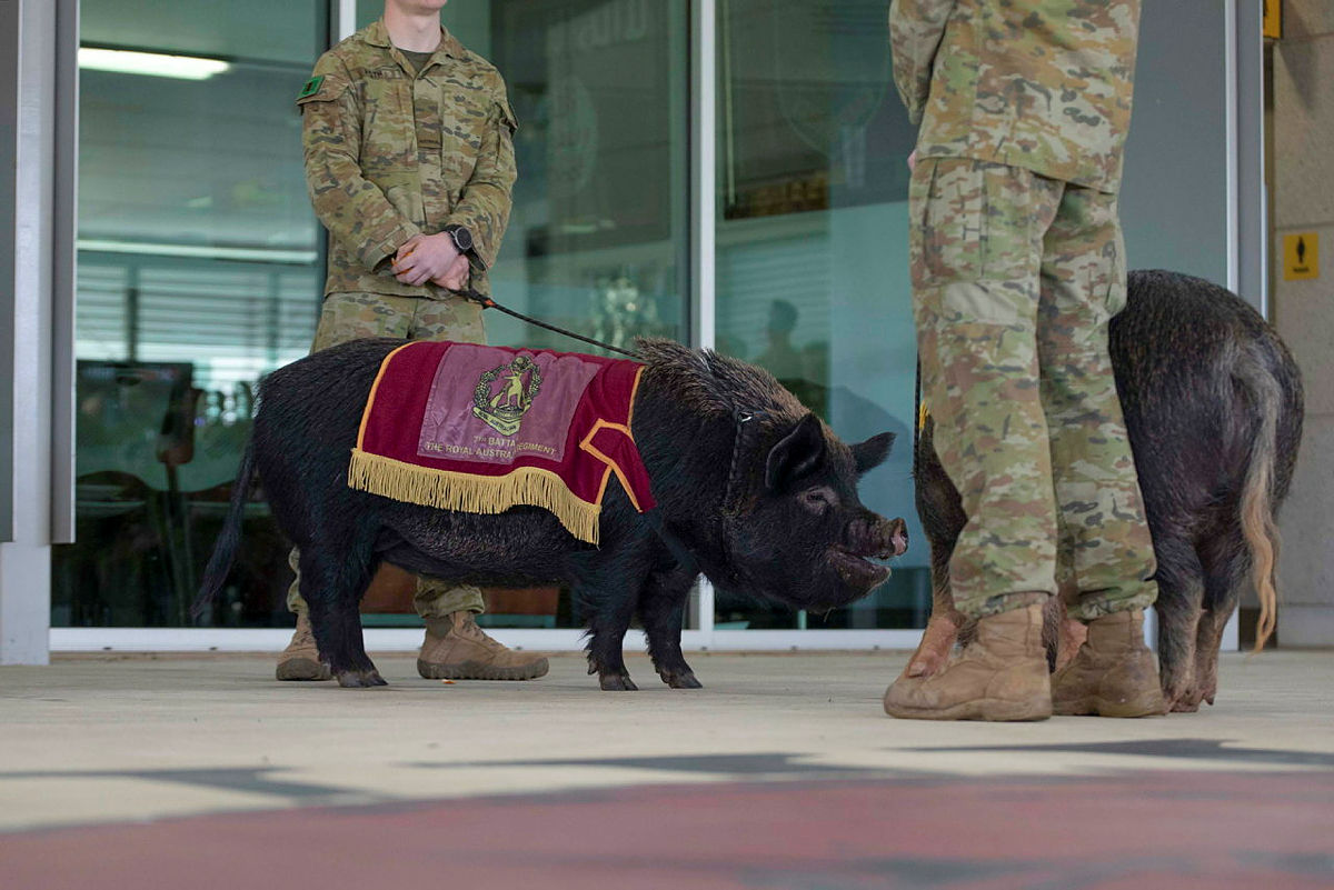 Clad in unit colours, William and Elizabeth, the beloved pig mascots of the 7th Battalion, the Royal Australian Regiment (7RAR), trotted through Horseshoe Lines at RAAF Base Edinburgh for the final time.