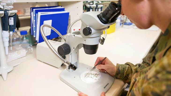 CAPTION: Major Lisa Rigby sorts a petri dish of adult mosquitoes to identify vectors of human disease at the ADF Malaria and Infectious Disease Institute at Gallipoli Barracks.