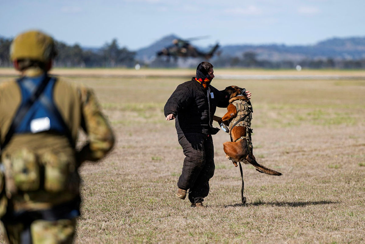 CAPTION: Military police dog Doza detains trainee Lance Corporal Dakoda Berg in a bite suit during the Military Police Dog Handler Course – Field Operations at Swartz Barracks, Oakey. Image has been digitally altered.
