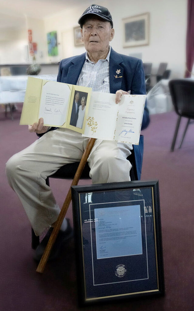 CAPTION: Phillip ‘Monro’ Preuss shows off his letters from King Charles III, Prime Minister Anthony Albanese and Chief of Air Force, Air Marshal Stephen Chappell, during his 100th birthday party.