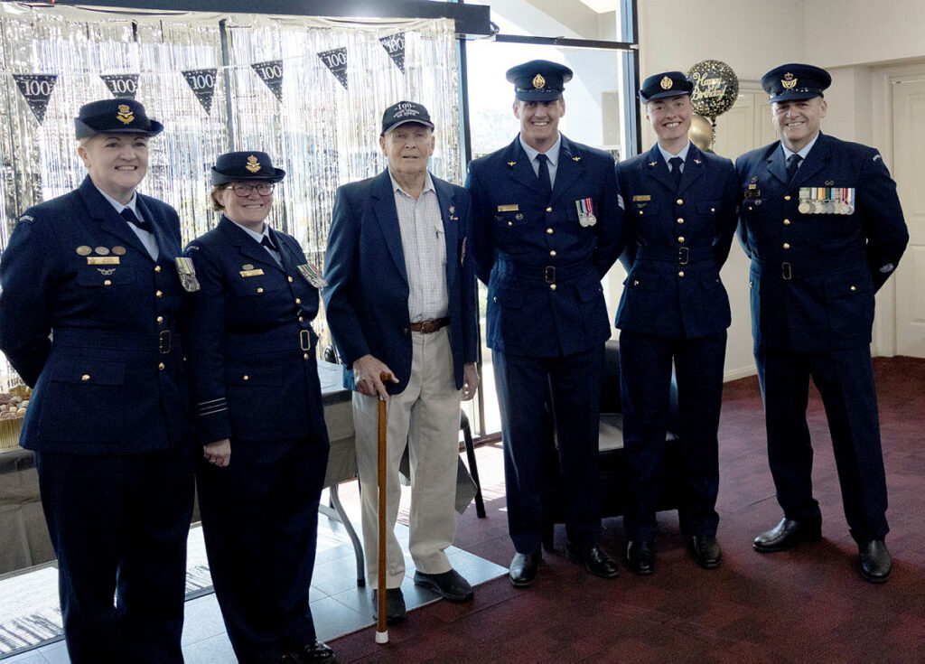 CAPTION: Phillip ‘Monro’ Preuss celebrates turning 100 with 1 Recruit Training Unit members, from left, Wing Commander Jodie Mason, Squadron Leader Shannon Monk, Sergeant Nick Harrison, Corporal Tahlia Stockley and Warrant Officer David Harding.
