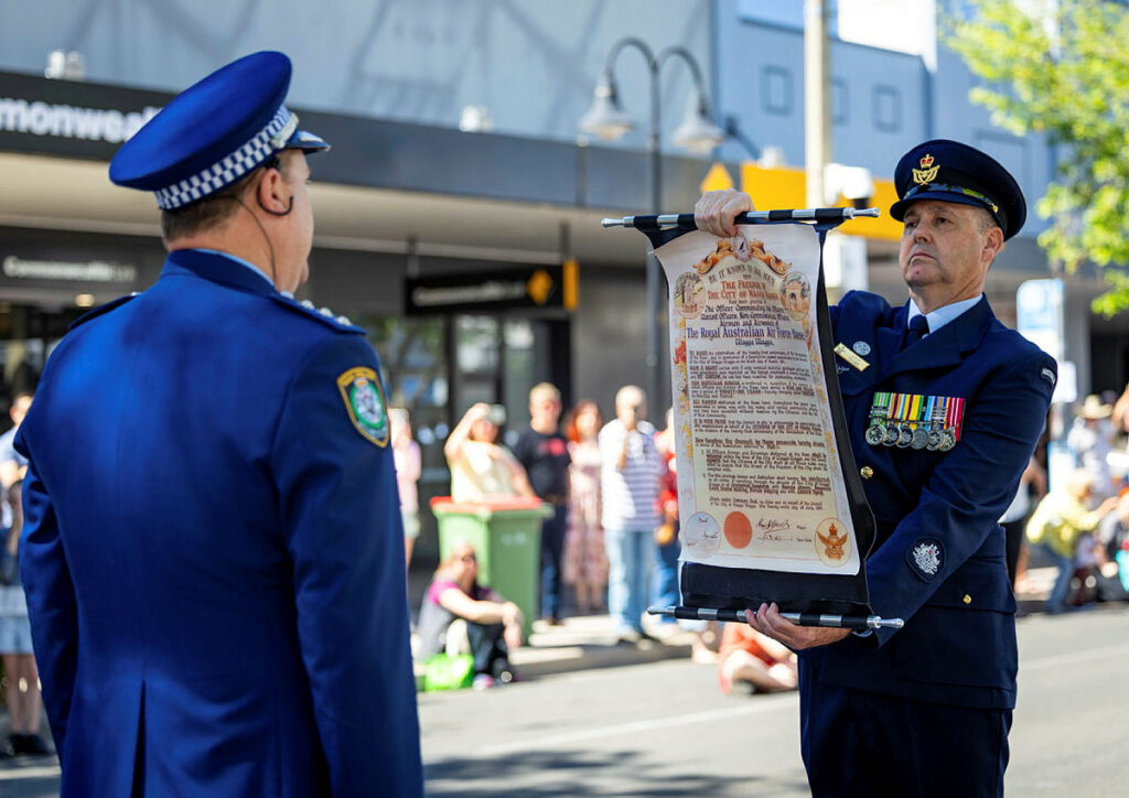 CAPTION: Base Warrant Officer 31 Squadron Andy Thame presents a scroll as the Royal Australian Air Force exercises its Freedom of Entry through the streets of Wagga Wagga, NSW. Photo by Leading Aircraftwoman Paris Rigney.