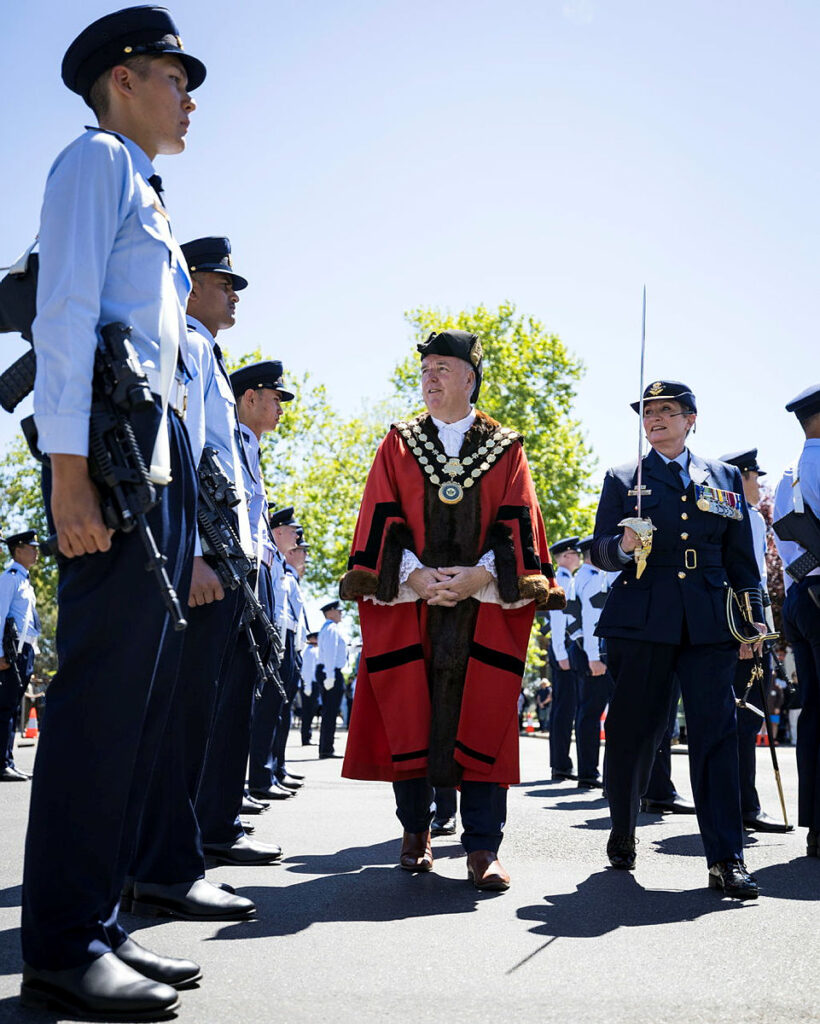 CAPTION: City of Wagga Wagga Mayor Councillor Dallas Tout reviews the squadron during RAAF Base Wagga’s Freedom of Entry parade. Photo by Aircraftman Jakob Reid.