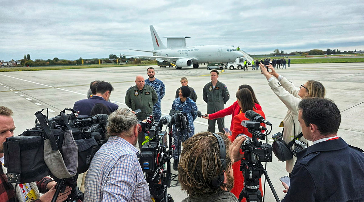 CAPTION: Australia’s Military Representative to NATO Air Vice-Marshal Di Turton, centre, addresses media with members of the E-7A contingent at Melsbroek Airbase in Brussels, Belgium.