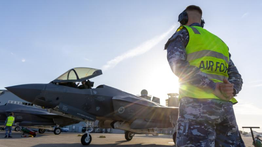 CAPTION: RAAF avionics technician Aircraftman Izaak Mazurek guides an F-35A Lightning II into position.