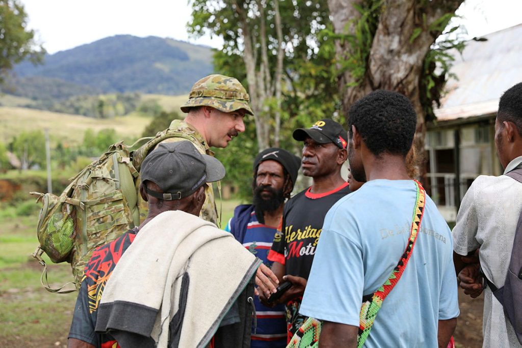 CAPTION: Australian Army’s Chaplain Mitchell Porter speaks to people in Tok Pisin in Woitpe village during a community outreach activity in the Central Highlands of Papua New Guinea.