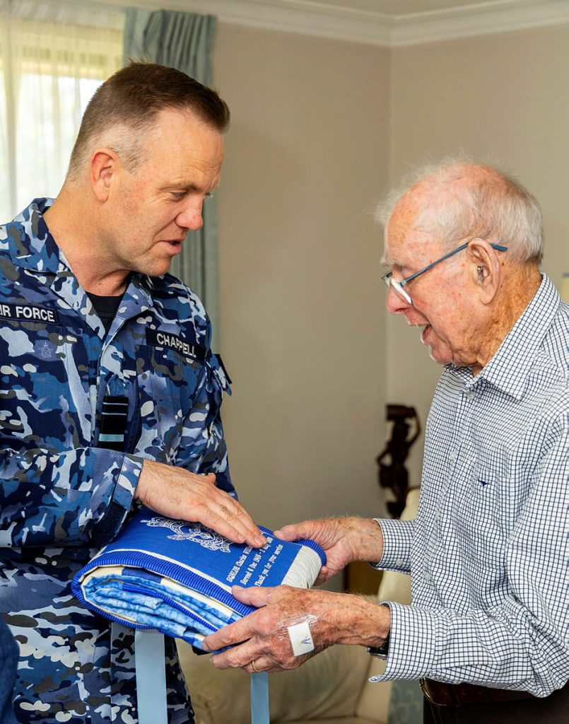 Charles and his wife Gwen were visited in their home in Canberra by Air Marshal Chappell on October 24. Air Marshal Chappell presented Charles a custom Aussie Hero Quilt, thanking him for his service from 1946 to 1978.