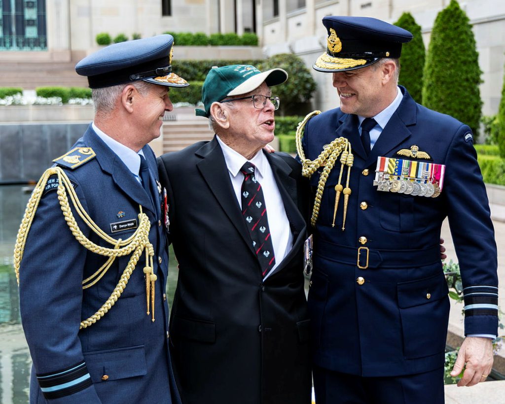 CAPTION: Chief of Air Force Royal New Zealand Air Force, Air Vice-Marshal Darryn Webb, left, and Chief of Air Force Air Marshal Stephen Chappell flank Air Force veteran Charles Reif at the Australian War Memorial, Canberra. Photo by Aircraftman Jakob Reid.