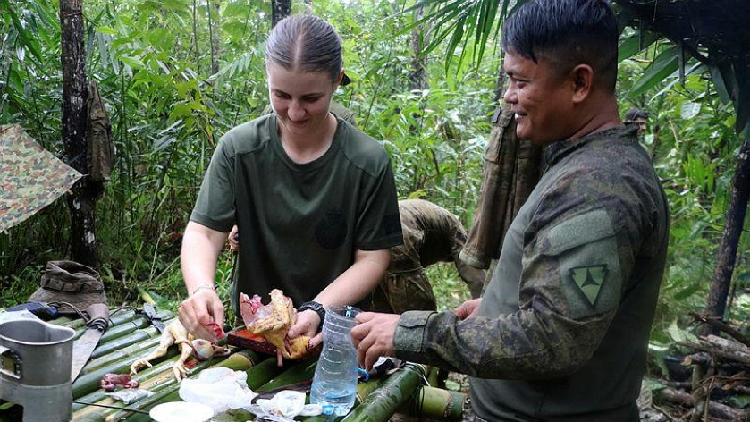 CAPTION: A Philippine Army soldier shows Australian Army Sapper Kaja Roberts how to butcher chicken during a jungle survival course in the Philippines.