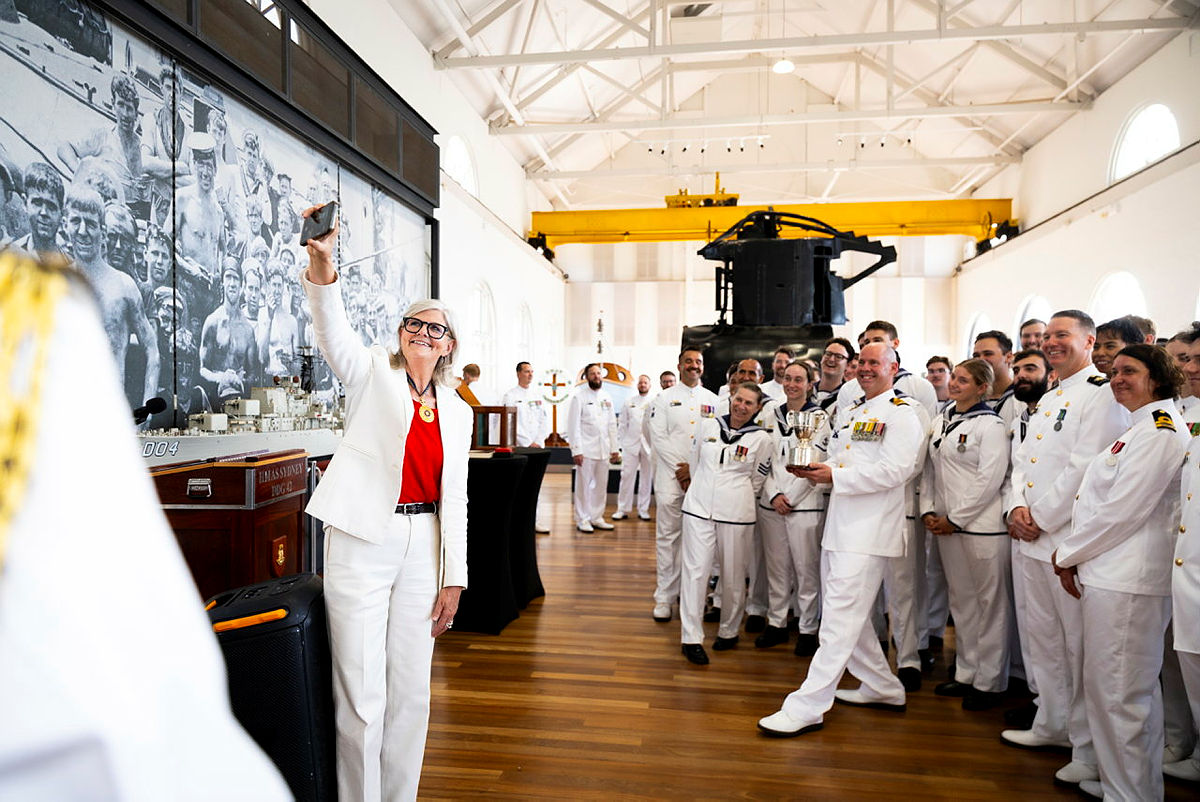 CAPTION: Her Excellency the Honourable Ms Sam Mostyn AC, Governor-General of the Commonwealth of Australia takes a selfie with the crew of HMAS Sydney at the HMAS Kuttabul Heritage Centre, NSW. Photo by Leading Seaman David Cox.