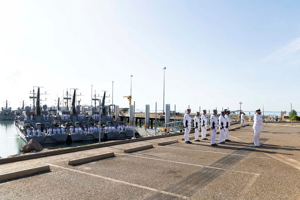 CAPTION: Ship’s company of HMA Ships Bathurst, Albany and Childers line the decks during the decommissioning ceremony held at HMAS Coonawarra, in the Northern Territory. Story by Lieutenant Commander Anthony Martin. Photos by Leading Seaman Lauren Pugsley.