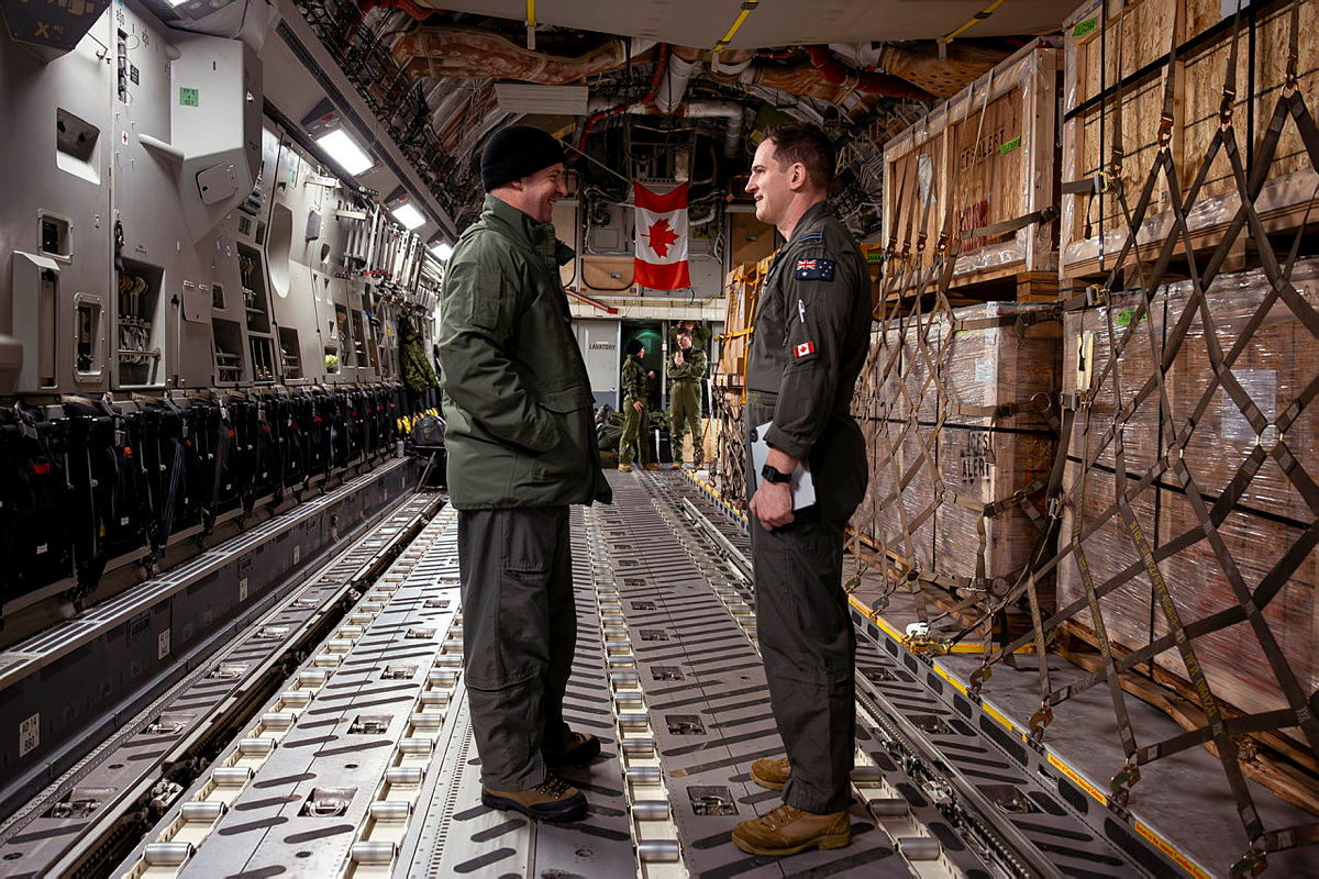 CAPTION: RAAF’s Corporal Scott Howes and Flight Lieutenant Luke Duffy discuss operations on board a CC-177 Globemaster (701) at 8 Wing/Canadian Forces Base Trenton.