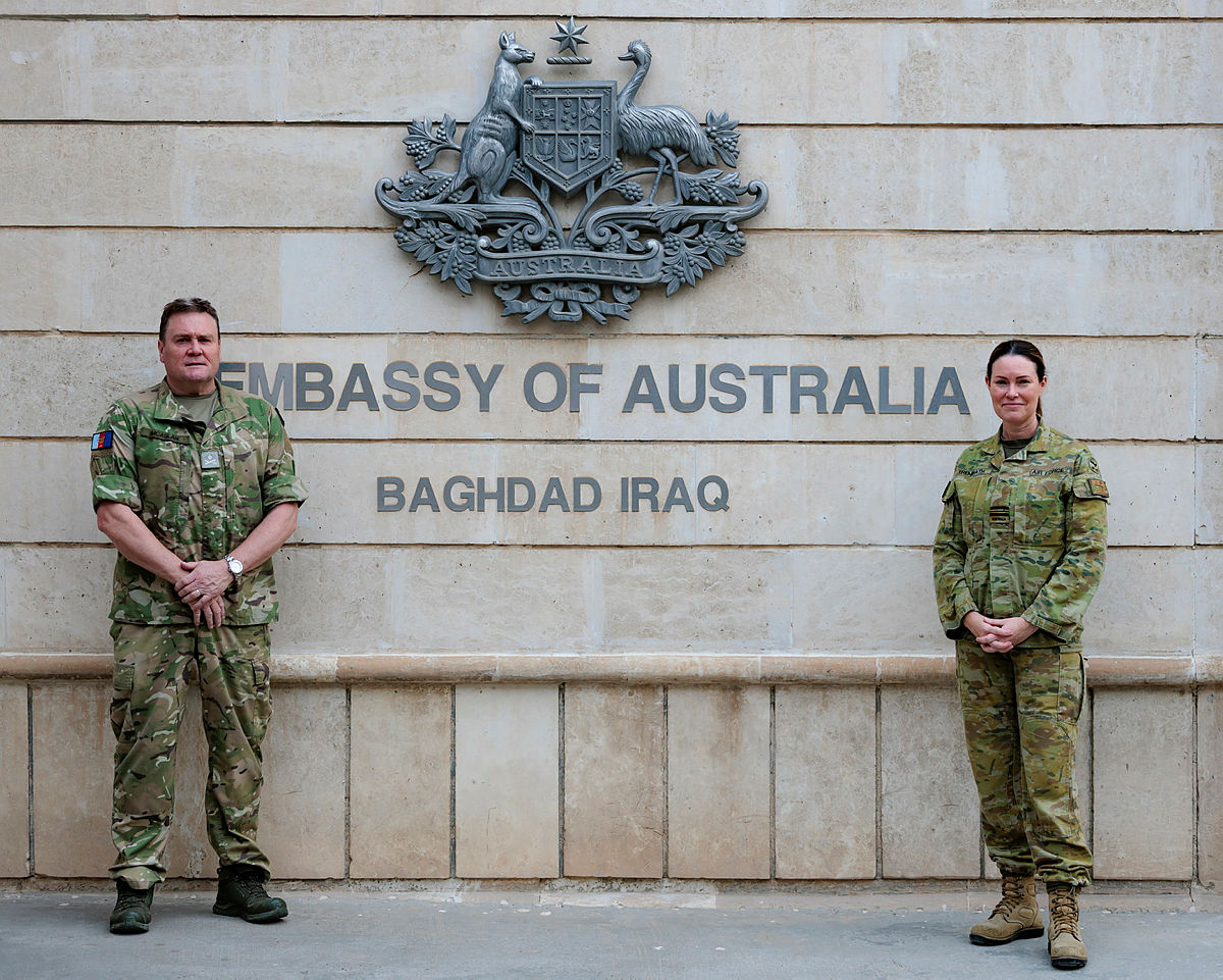 CAPTION: Deputy Chief of Joint Operations, Major General Hugh McAslan, and Squadron Leader Rebecca Trembath at the Australian Embassy, Iraq.
