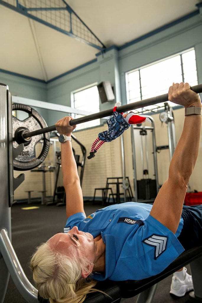 CAPTION: Sergeant Chrystal Singh from 22 Squadron gets a hand from Alfie the Elf with her bench press in RAAF Base Richmond’s gym.