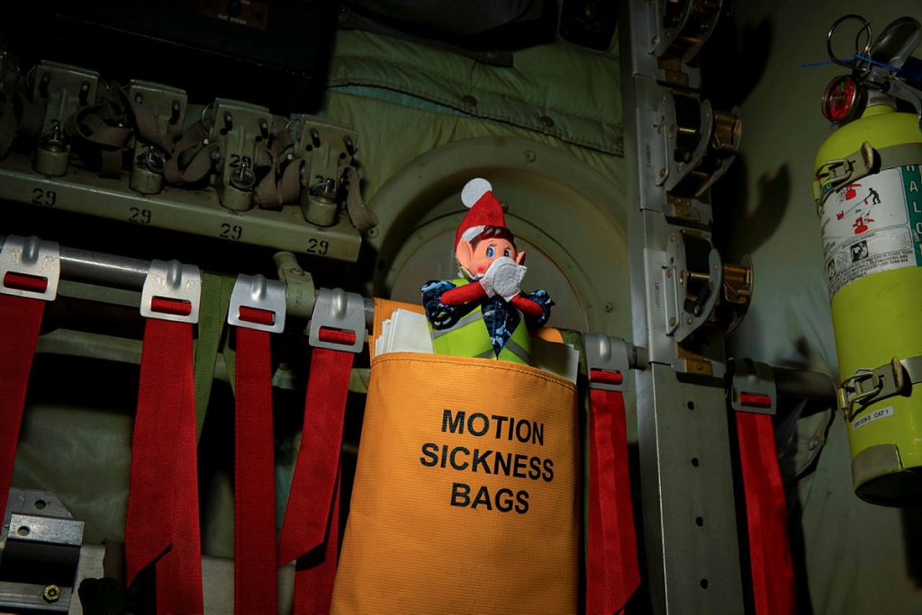 CAPTION: Alfie the Elf gets queasy on a C-130J Hercules at RAAF Base Richmond.
