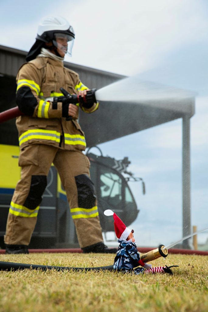 CAPTION: Alfie the Elf joins Aircraftman Michael Baghdadi to practise with fire hoses at RAAF Base Richmond.