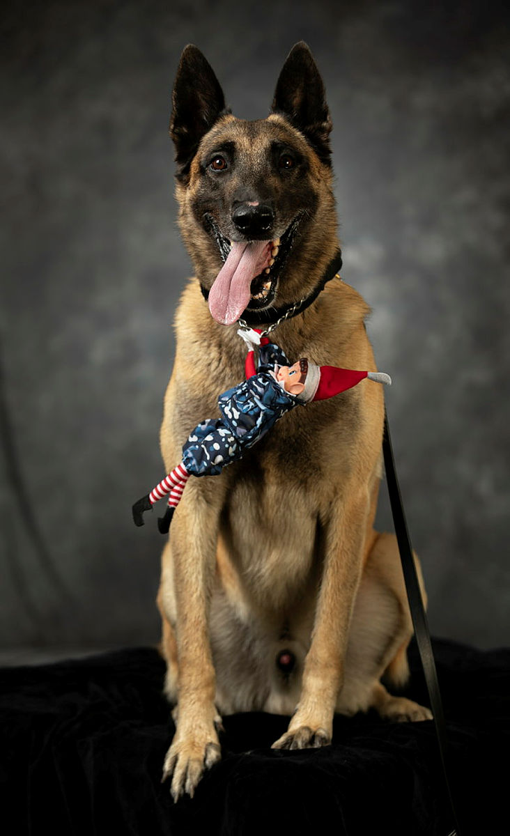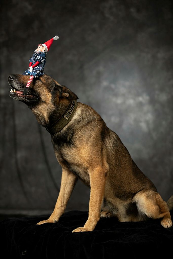 CAPTION: Alfie the Elf hangs out with military working dog Xenon from 22 Squadron at RAAF Base Richmond.
