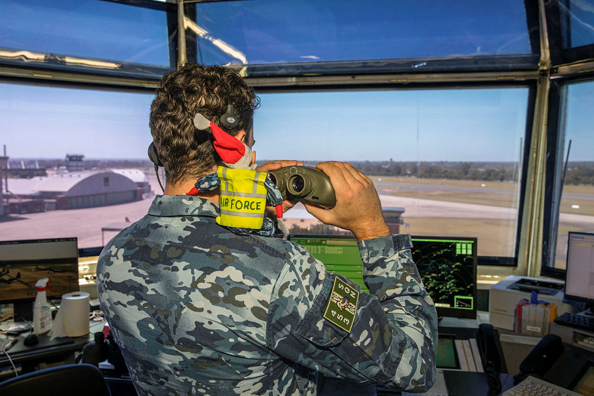 CAPTION: Alfie the Elf lends a hand at the RAAF Base Richmond air traffic control tower.