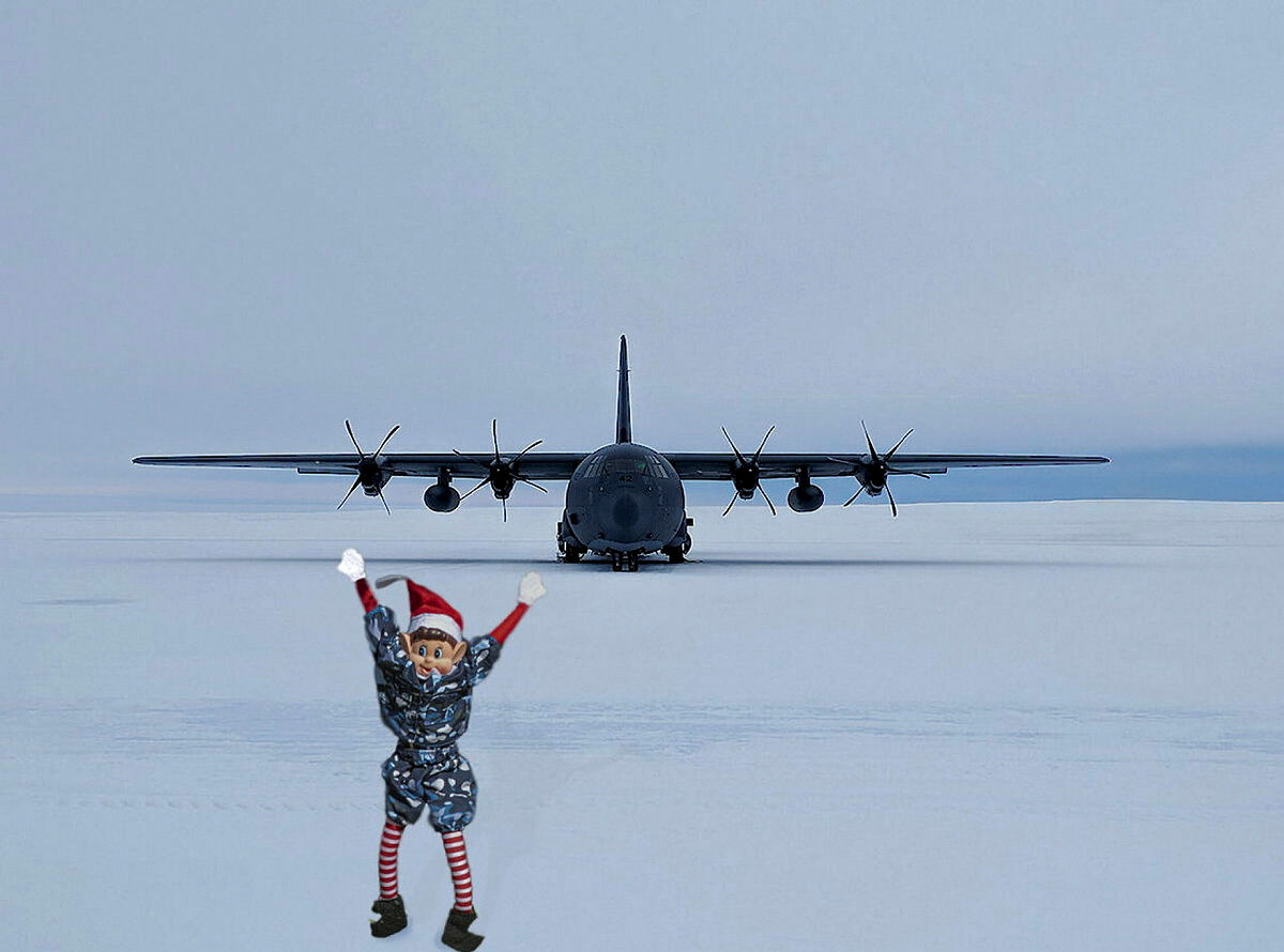 CAPTION: Christmas elf Airborne Alfie in front of a C-130J Hercules after the arrival in the NorthPole.