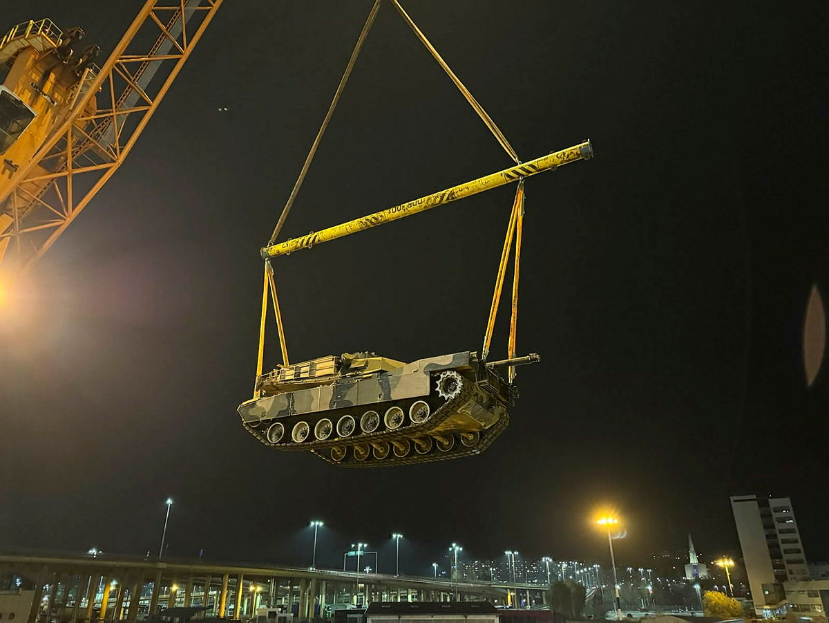 CAPTION: Australian M1A1 Abrams tanks bound for Ukraine are unloaded in Europe after arriving from Australia on a cargo ship.