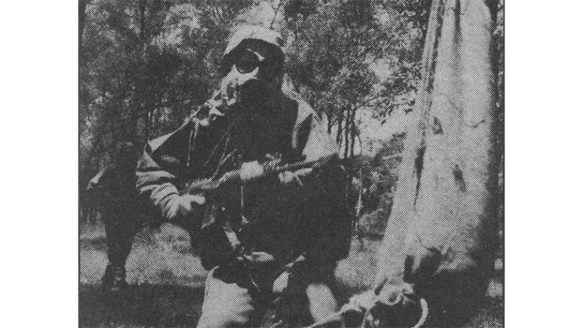 CAPTION: A black-and-white newspaper clipping from a 1980s Army Newspaper showing an armed military member wearing a gas mask.